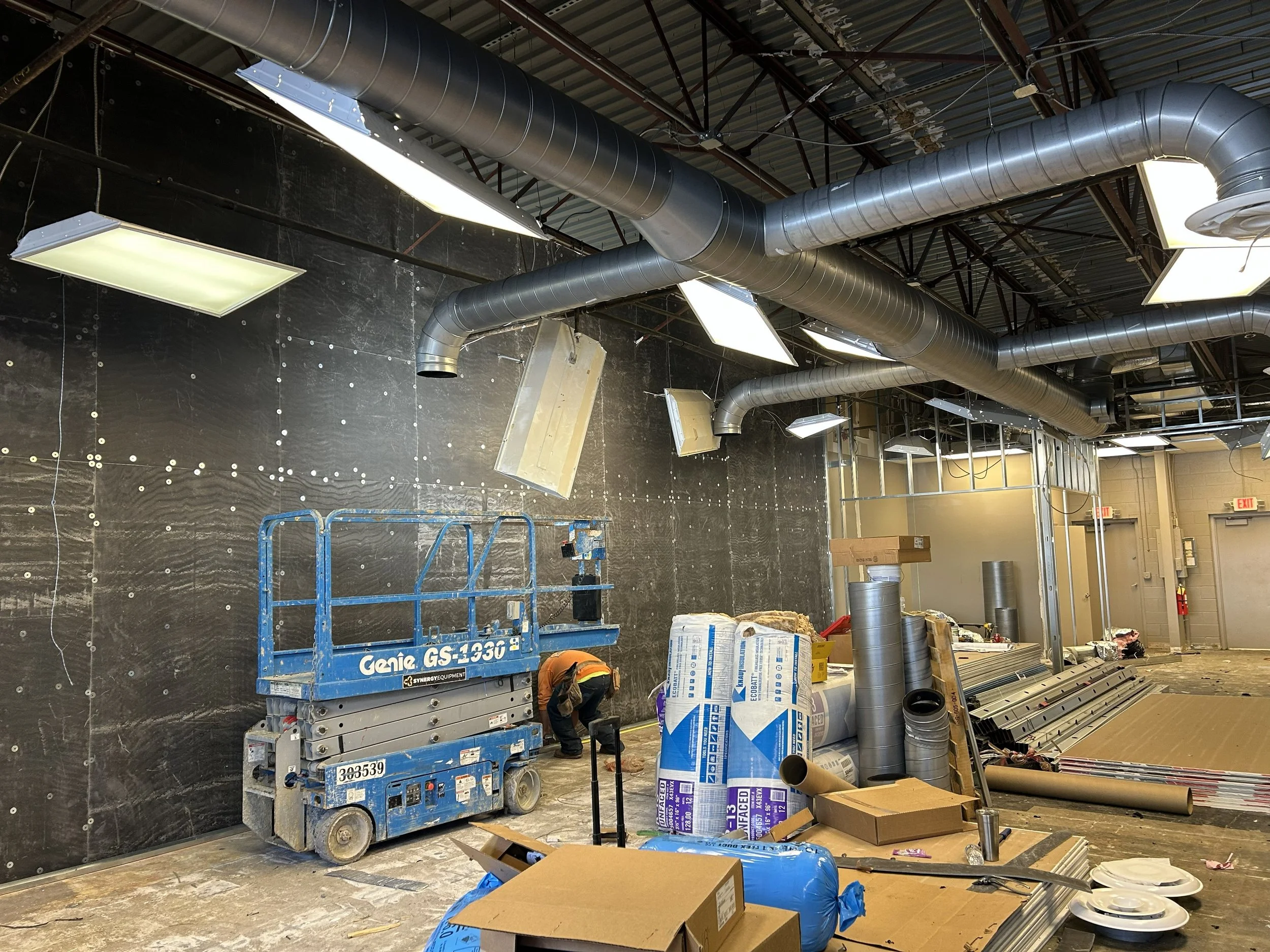 This layered wall assembly significantly reduces sound transmission between suites — protecting neighboring tenants and maintaining the center’s performance standards.